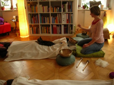 Die Klangschalenbenmassage kann wahlweise am Boden oder am Massagebett genossen werden.